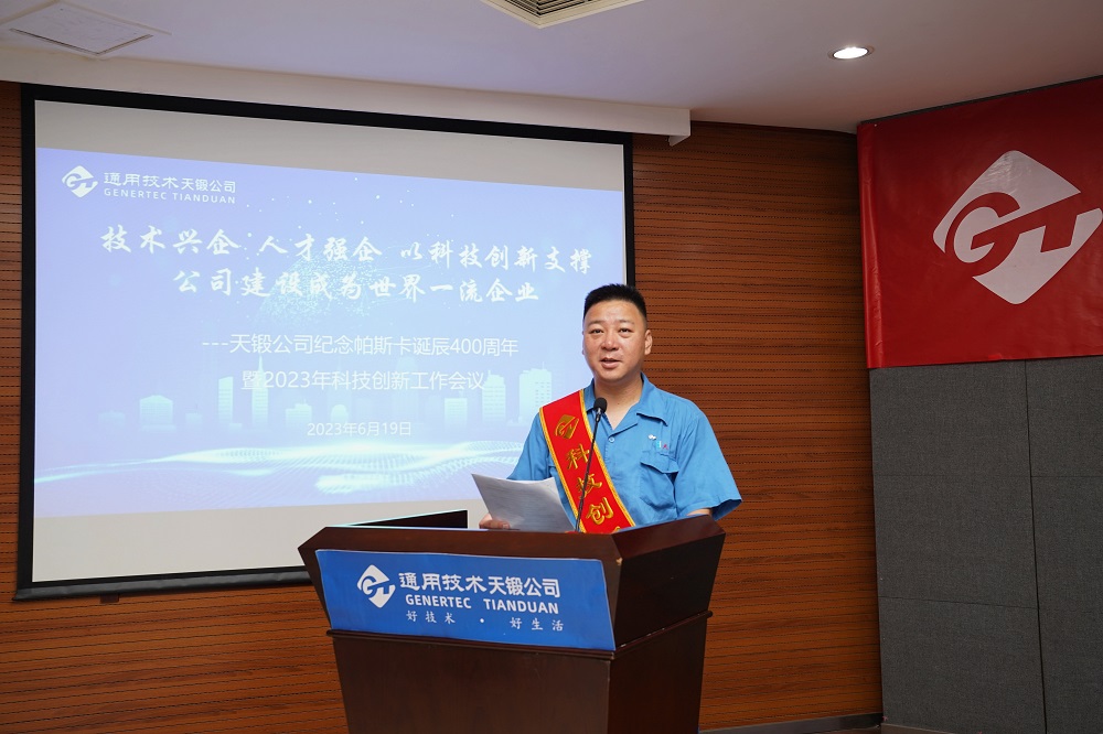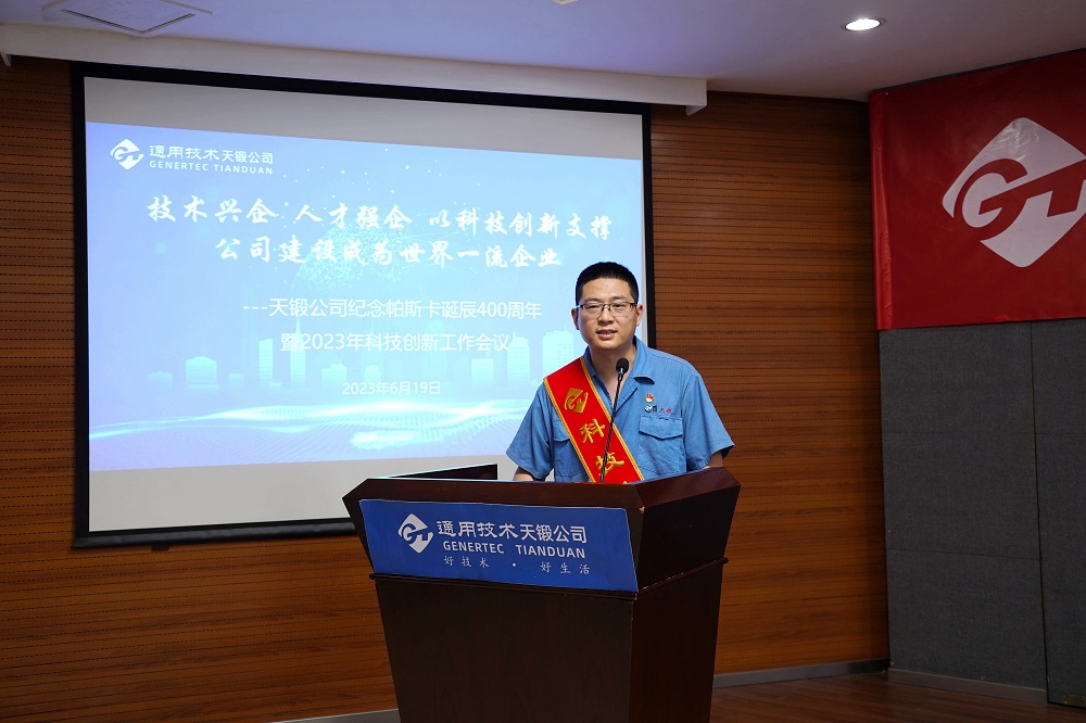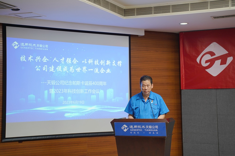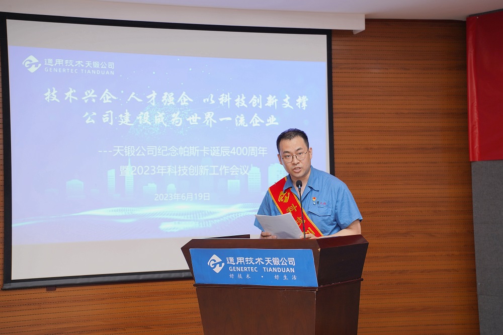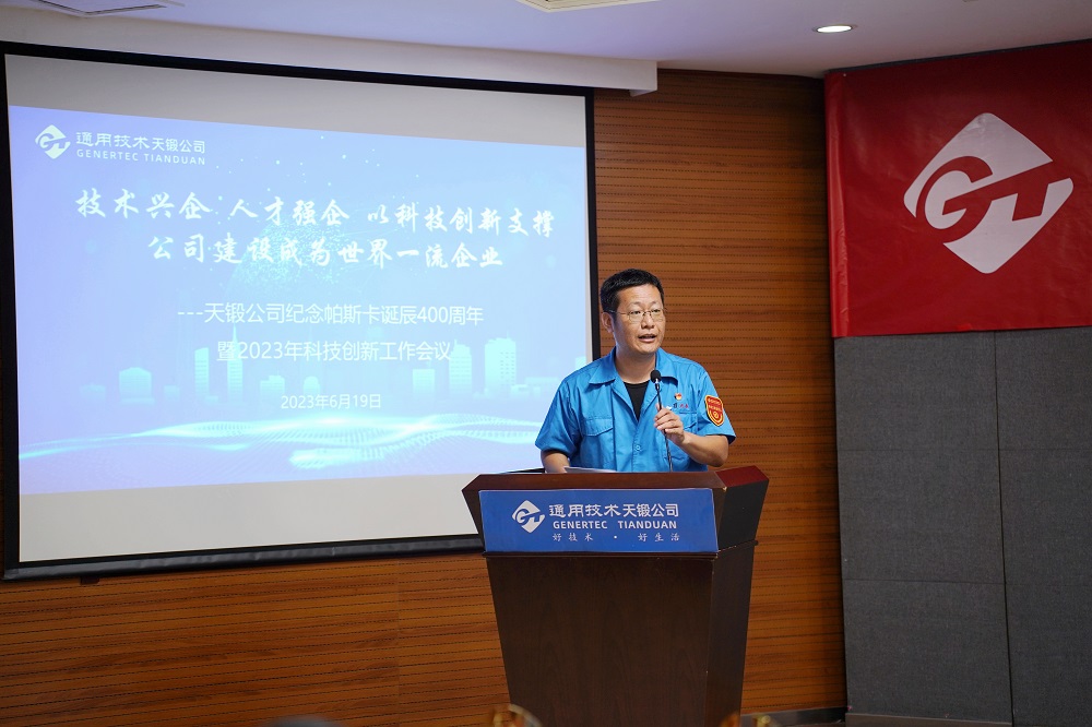 2023年6月19日,時逢法國科學家布萊士·帕斯卡誕辰400周年,天鍛公司隆重召開紀念帕斯卡誕辰400周年暨2023年科技創新工作會議,會議主題是“技術興企,人才強企,以科技創新支撐公司建設成為世界一流企業”。公司領導、有關專家、科技人員代表、各單位和基層黨組織負責人共計近150人參會。