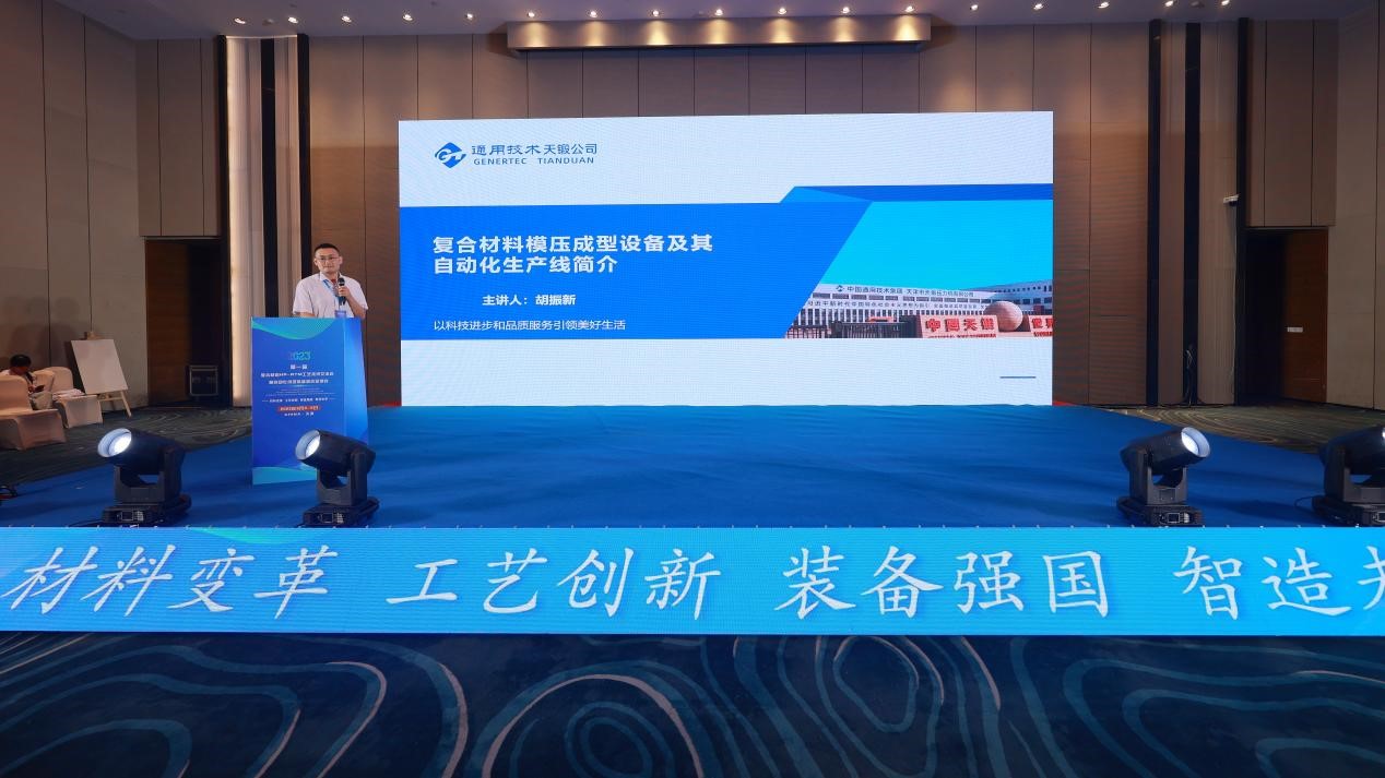 通用技術機床公司市場管理部總經理蘇曉川,天鍛公司黨委副書記、總經理劉林志,副總經理劉玉民、副總經理王世明、行業專家康連順等領導專家出席會議,天鍛公司設計院復合材料所所長胡振新作了題為“復合材料模壓成型設備及其自動化生產線簡介”的報告。