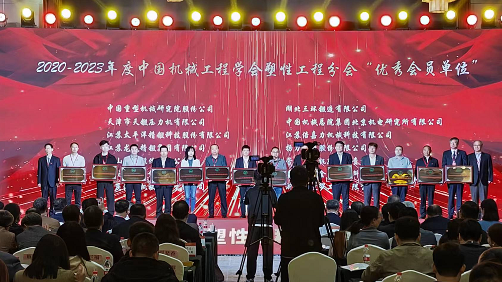 大會(huì)以“提高自主創(chuàng)新能力 扎實(shí)推進(jìn)產(chǎn)業(yè)基礎(chǔ)再造工程”為主題,邀請(qǐng)了多位院士參加并作主旨報(bào)告。大會(huì)鑒于天鍛公司近三年來在塑性成形領(lǐng)域推進(jìn)產(chǎn)學(xué)研用融合、開展科技創(chuàng)新等方面取得的突出成績(jī)以及對(duì)學(xué)會(huì)各項(xiàng)工作的大力支持,評(píng)選天鍛公司為2020-2023年度中國機(jī)械工程學(xué)會(huì)塑性工程分會(huì)優(yōu)秀會(huì)員單位。