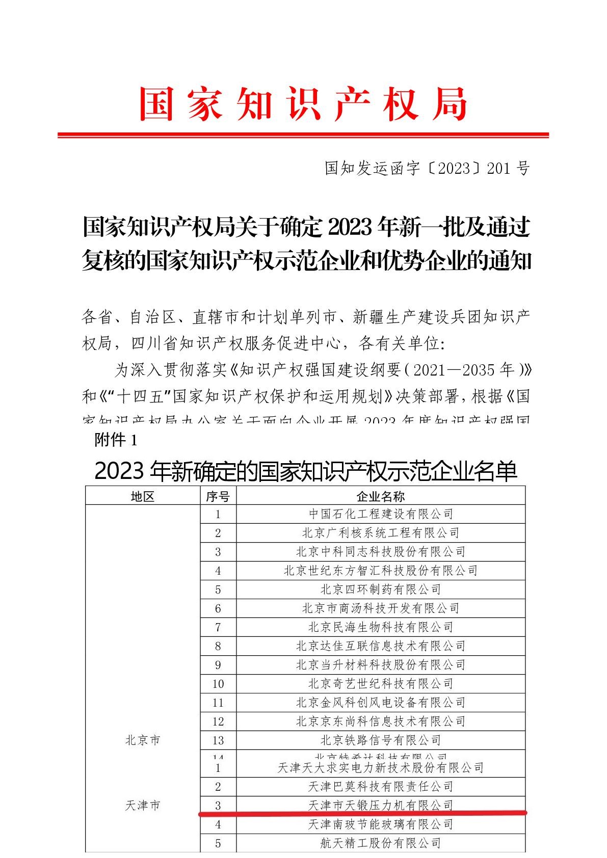 近日,國家知識產權局發布《國家知識產權局關于確定 2023 年新一批及通過復核的國家知識產權示范企業和優勢企業的通知》。經企業申報、天津市知識產權局推薦、國家知識產權局批準,天鍛公司成功入選2023年新確定的國家知識產權示范企業名單。
