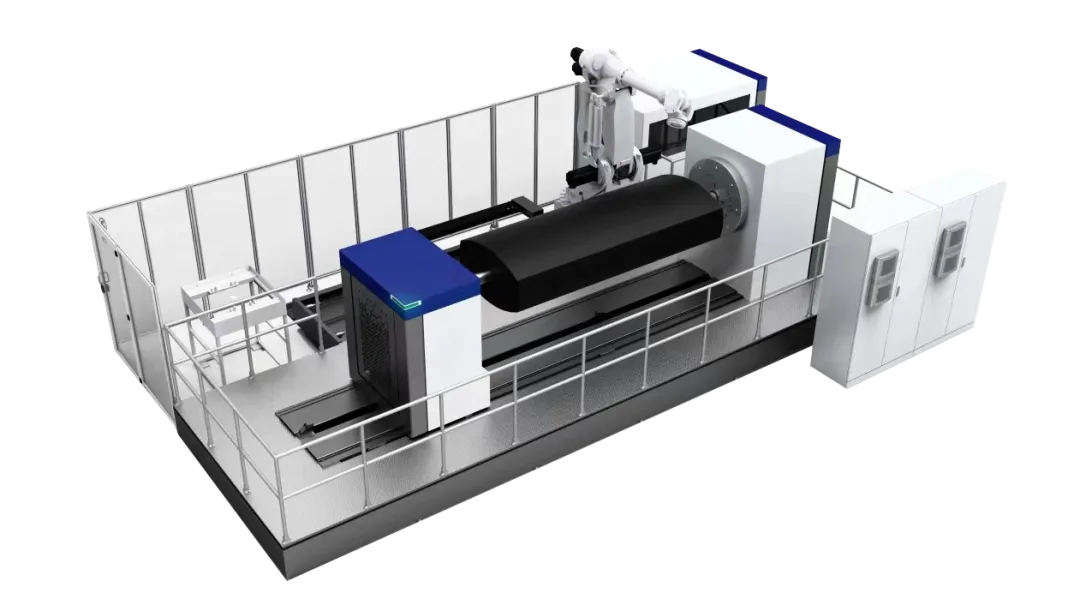 該產品適用于新能源等重點領域的復雜型面的復合材料五軸聯動加工,具有高速度、高效率、高安全性、綠色環保等特點。橫梁采用高剛性加長設計,橋梁間距4700mm,通過性更好,適合大尺寸工件加工;高速電主軸銑頭為單臂式結構,采用力矩電機直驅,最高轉速20000r/min,可有效提升加工效率;直線軸均為滾柱直線導軌,全齒輪齒條傳動,最高速度可達85m/min,并配備液壓緩沖與線性制動雙重保護,安全性大幅提升;產品標配柔性護頂的全封閉式防護結構,安全環保性能優異。