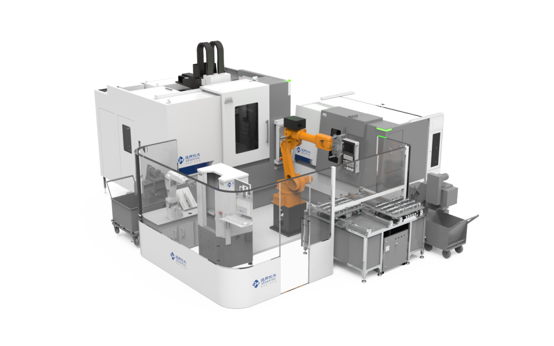 該單元適用于不同規格電機軸的快速換產和工件自動加工檢測,由1臺HTC40P高精度臥式數控車床、1臺VMC1100P高性能立式加工中心、1臺M45型軸類零件測量儀、2臺6軸關節機器人和1套雙工位交換托盤式料倉組成,能夠有效提升生產效率和良品率。