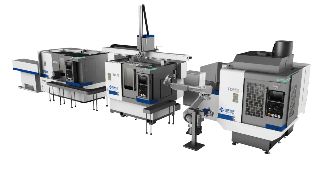 該生產線適用于環類零件的車削、銑削、鉆孔、攻絲等工序自動化高效加工,由2臺數控車床、1臺鉆攻中心、自動送料機、機動料道、桁架機械手、機器人、快換爪庫、旋轉下料倉等主輔設備組成。主機數控系統全部使用通用技術集團自主研發的i5系統,具備數據采集、程序調用、實時報警等數字化、智能化功能;配備電子看板,可實時顯示加工狀態、設備信息。