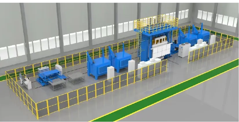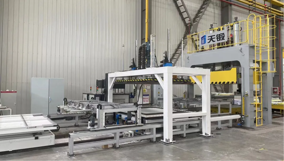 該生產線主要適用于新能源汽車復合材料輕量化應用,由裁切單元、預成型單元、模壓成型單元和切割加工單元等組成,整線年產量最大可達到10萬件。產線設備具有滑塊動態位置控制系統;具有國內首創微開模技術,實現自動調節鎖模力;采用全自動數字控制技術,設備加工一致性誤差小于10%;裝備遠程運維系統,可遠程快速診斷設備故障、實時狀態監測與預測性維護。