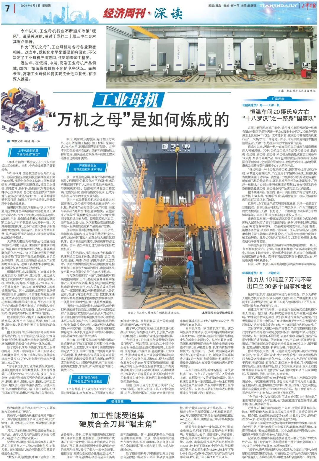 9月5日,《天津日報》“經(jīng)濟(jì)周刊”整版刊發(fā)《工業(yè)母機(jī) “萬機(jī)之母”是如何煉成的》一文。文章聚焦“工業(yè)母機(jī)”,以政策“暖風(fēng)”扶持為切入點(diǎn),展示了通用技術(shù)機(jī)床公司及其所屬天鍛公司作為中央企業(yè)被賦予的使命擔(dān)當(dāng)。