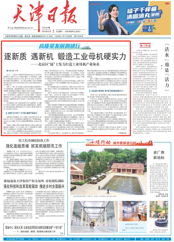 工業(yè)母機被稱為“制造設備的設備”,是裝備制造業(yè)發(fā)展水平的重要標志,是新質生產(chǎn)力的核心領域。天津在發(fā)展新質生產(chǎn)力上善作善成,牽頭梳理并繪制京津冀高端工業(yè)母機產(chǎn)業(yè)鏈圖譜,深化產(chǎn)業(yè)協(xié)作,打造京津冀工業(yè)母機創(chuàng)新高地。