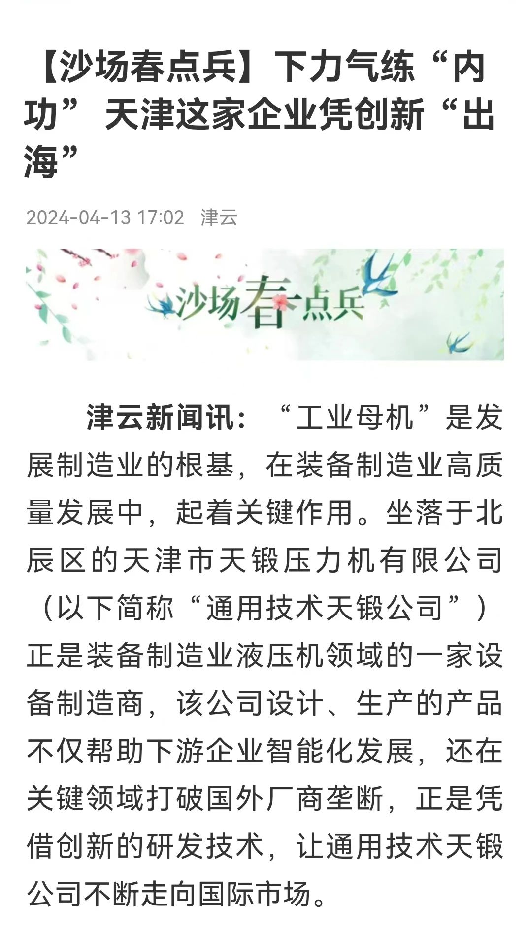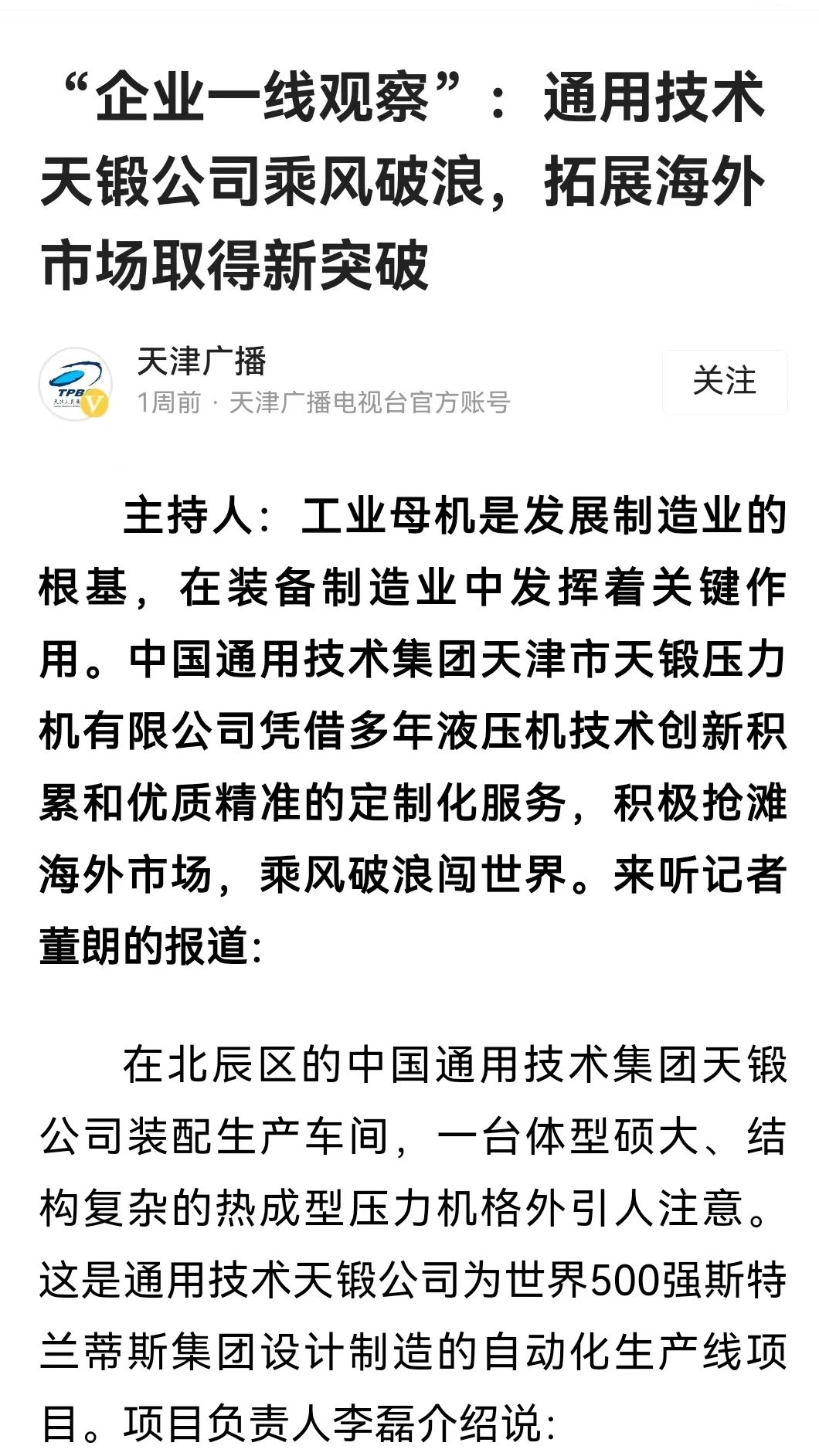 “工業母機是發展制造業的根基,在裝備制造業中發揮著關鍵作用。中國通用技術集團天津市天鍛壓力機有限公司憑借多年液壓機技術創新積累和優質精準的定制化服務,積極搶灘海外市場,乘風破浪闖世界。”